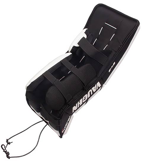 Die Vaughn Velocity VX1 Bambini Torwartschiene weiß-schwarz bietet maximale Beweglichkeit durch ihr flexibles Design und gleichzeitig zuverlässigen Schutz dank gepolsterter Innenzonen - perfekt für junge Goalies in der Lernphase.